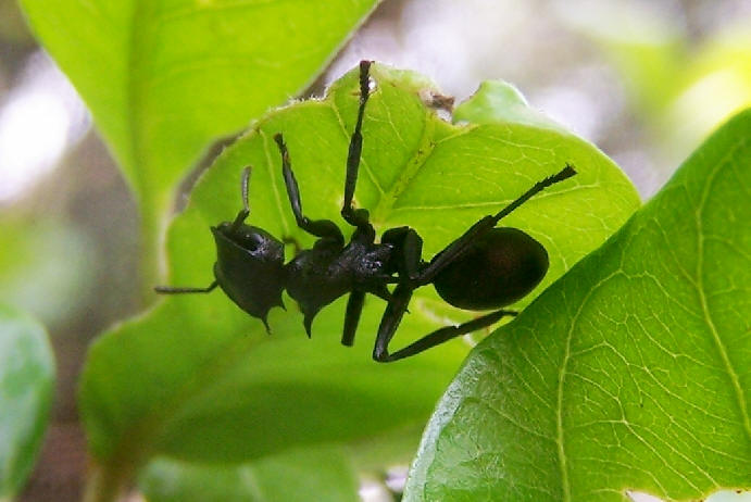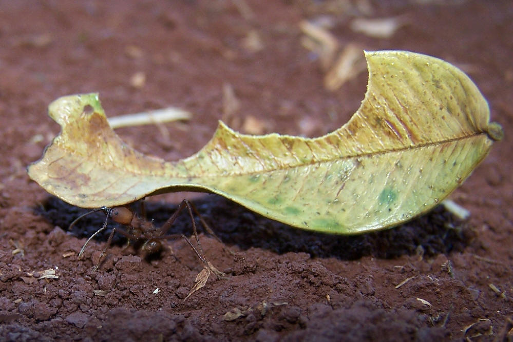 Con una extraordinaria fuerza una obrera lleva una hoja al nido, ni siquiera la toma cerca del centro de la gravedad, sino en uno de los extremos.
